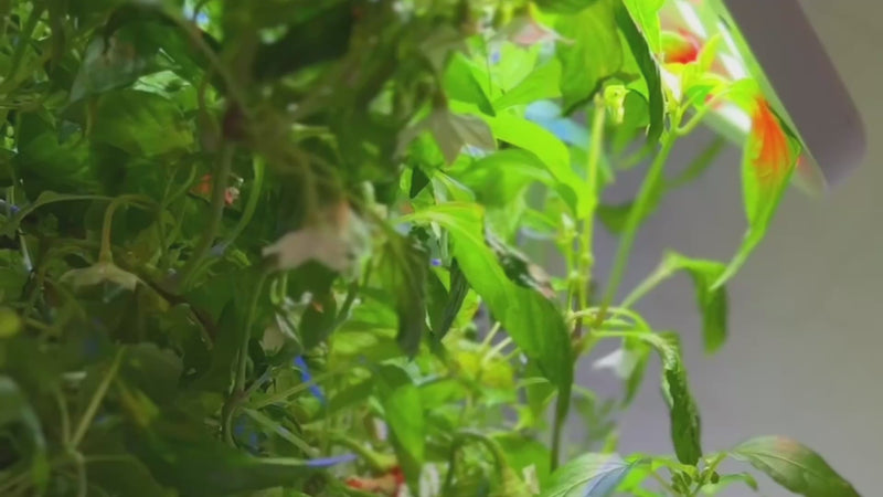 - Anpassningsbar belysning: Välj mellan Grönsaker och Blommor & frukter belysningslägen, och ställ in ljuset på 16 eller 22 timmar per dygn. Dessutom kan växtbelysningen vinklas uppåt för att ge plats åt högre växter.